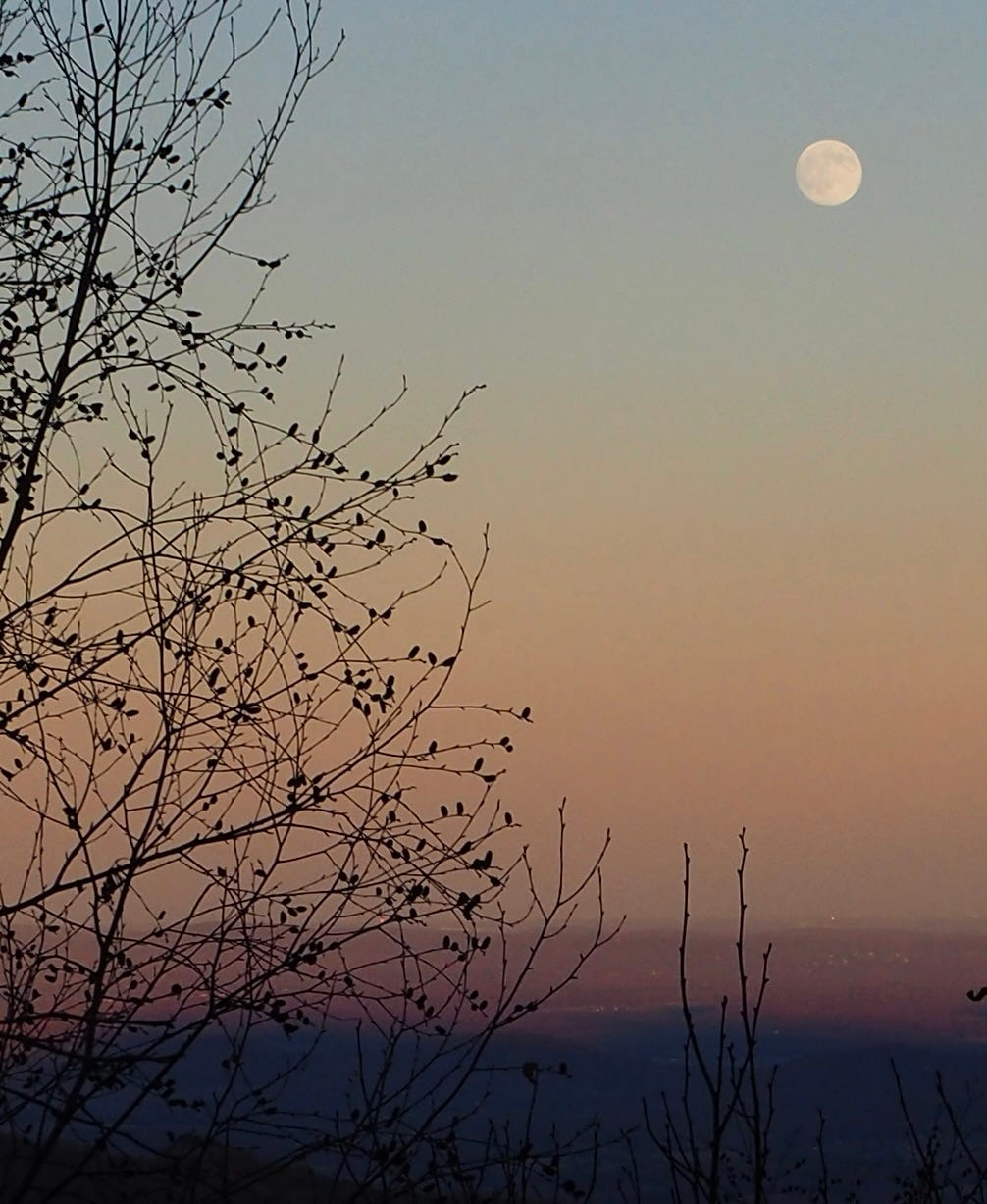Eventually, the switchbacks got shorter and shorter. The line of light and dark cast by the summit of this mountain was just in the trees, not thirty feet overhead. I kept going and when the trail broke through the trees, there it was. The Panorama. A nearly 360 degree view of the Shenandoah Valley. The sun was just setting to the west and a ghostly pale moon was rising from the haze of the east. Earth balancing the two celestial bodies out right in the middle.